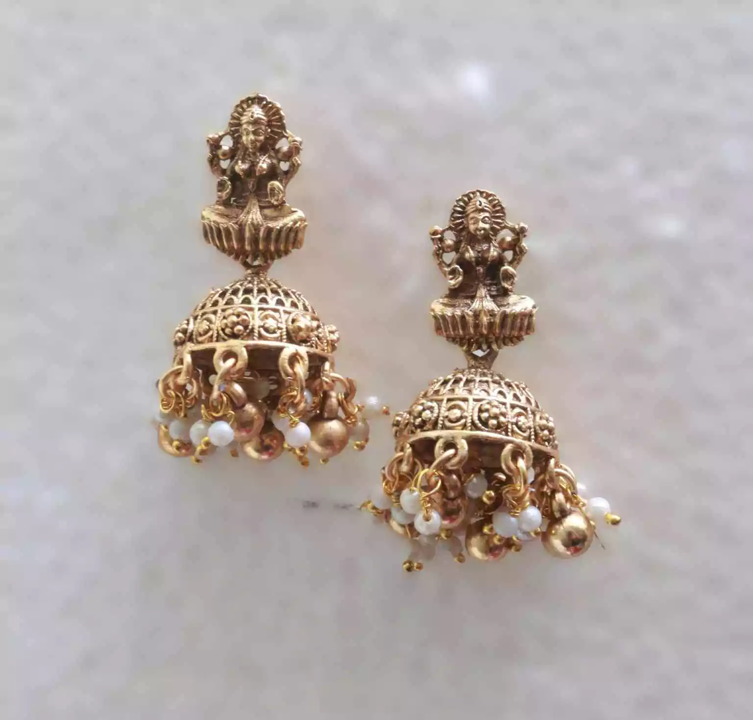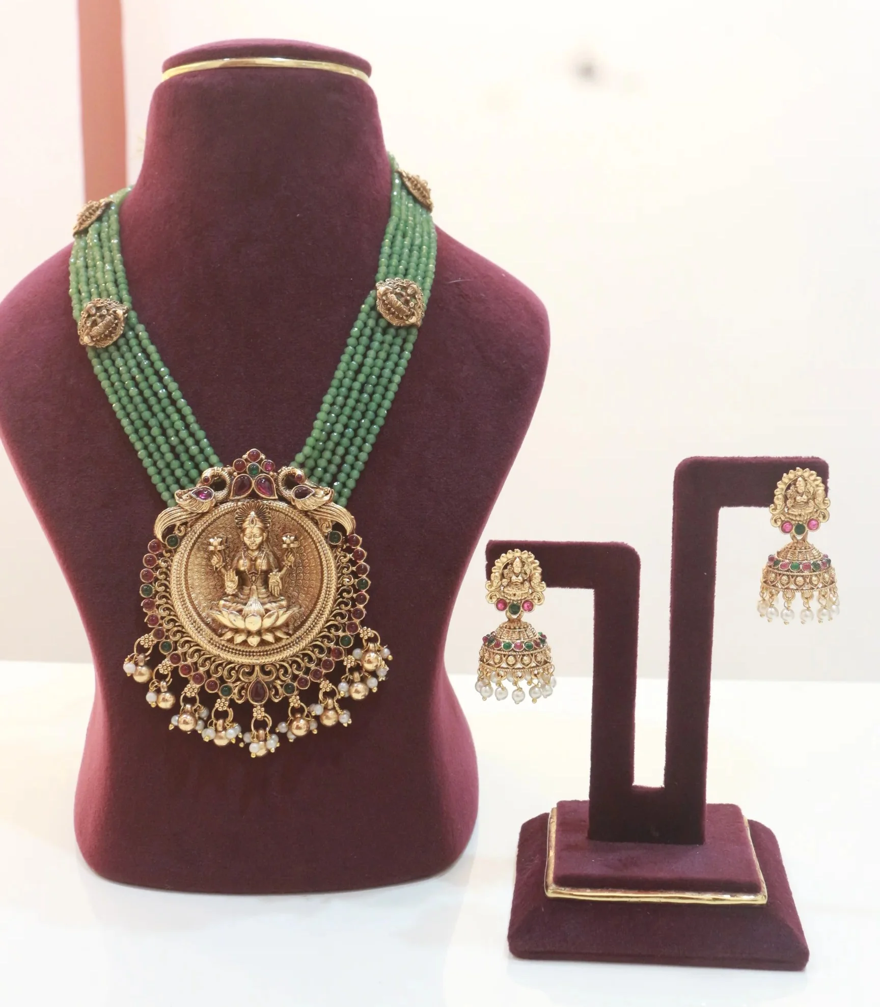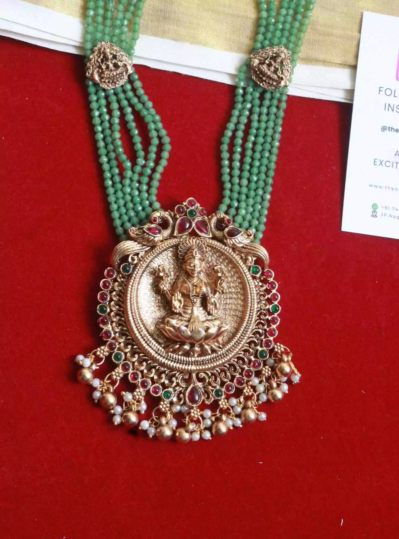 Design: Gajalakshmi motif pendant with peacock detailing, multi-strand bead work, and gold-tone discs