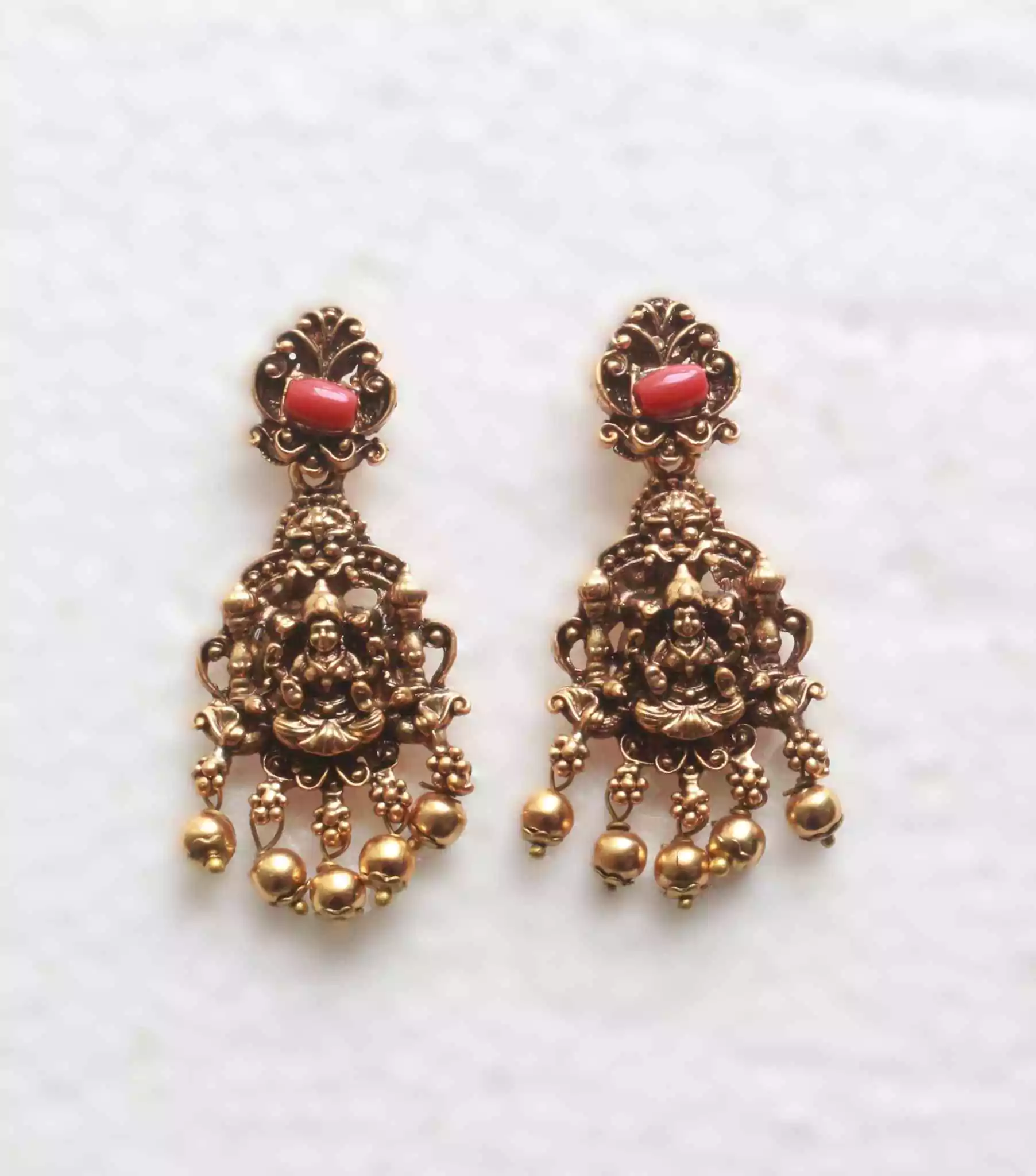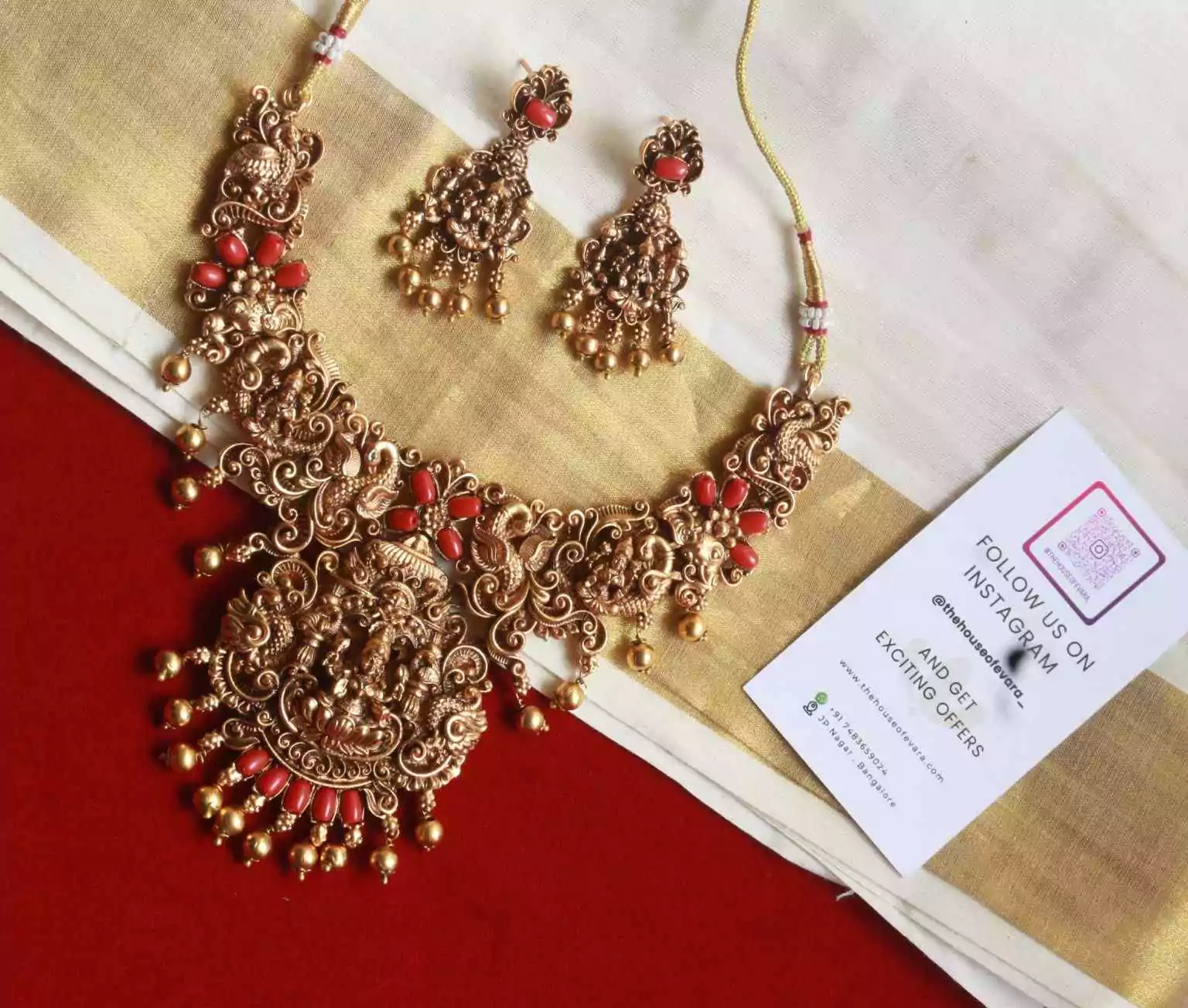Design: Temple-style necklace with coral red accents, floral motifs, and Lakshmi idol centerpiece