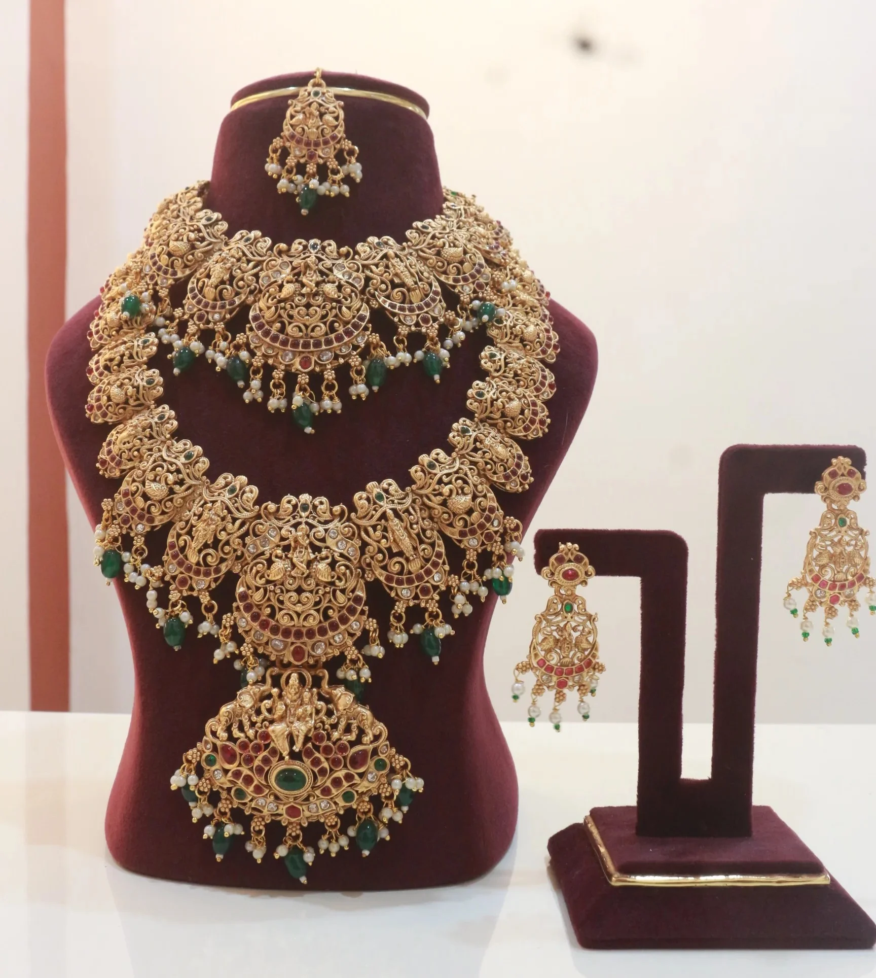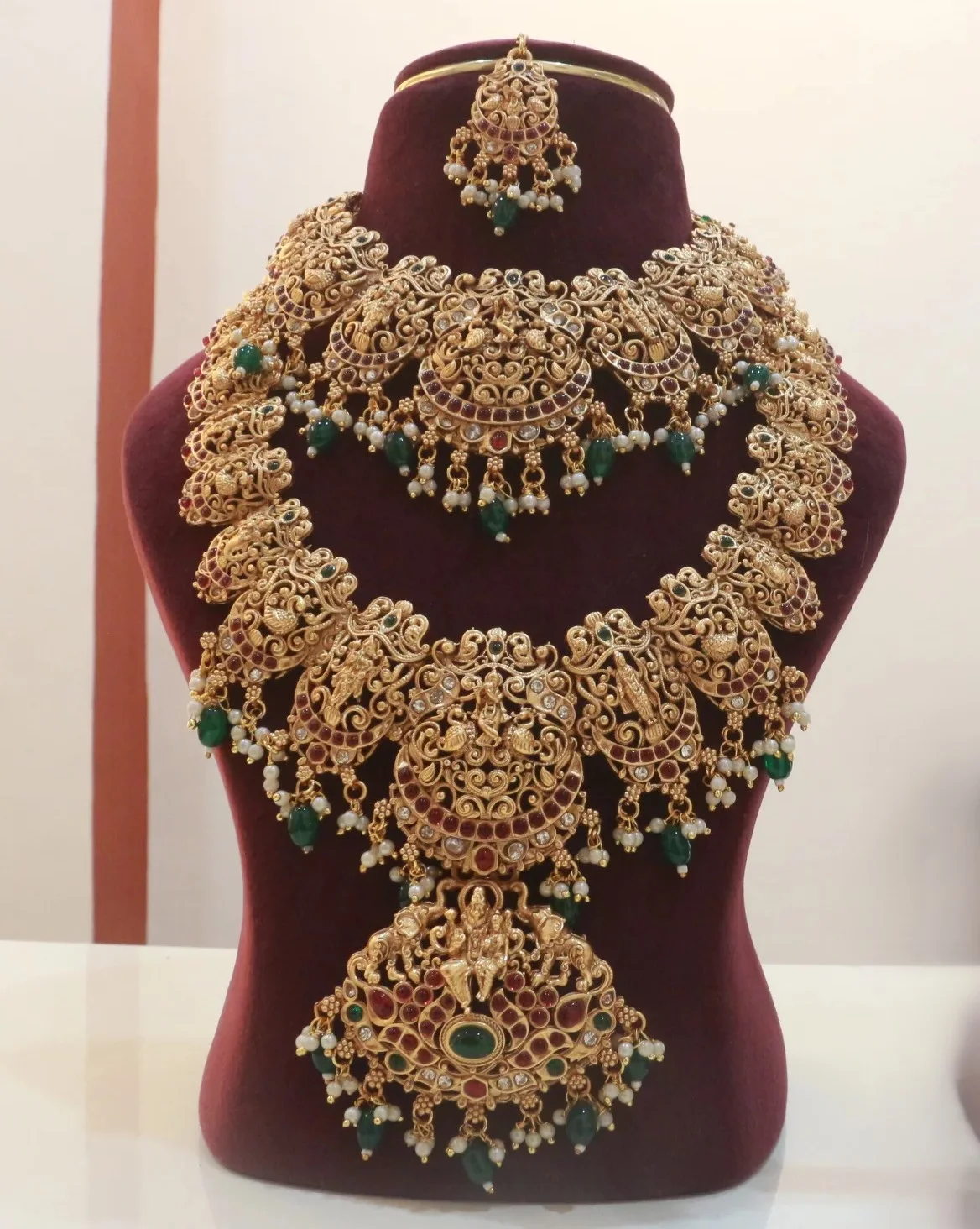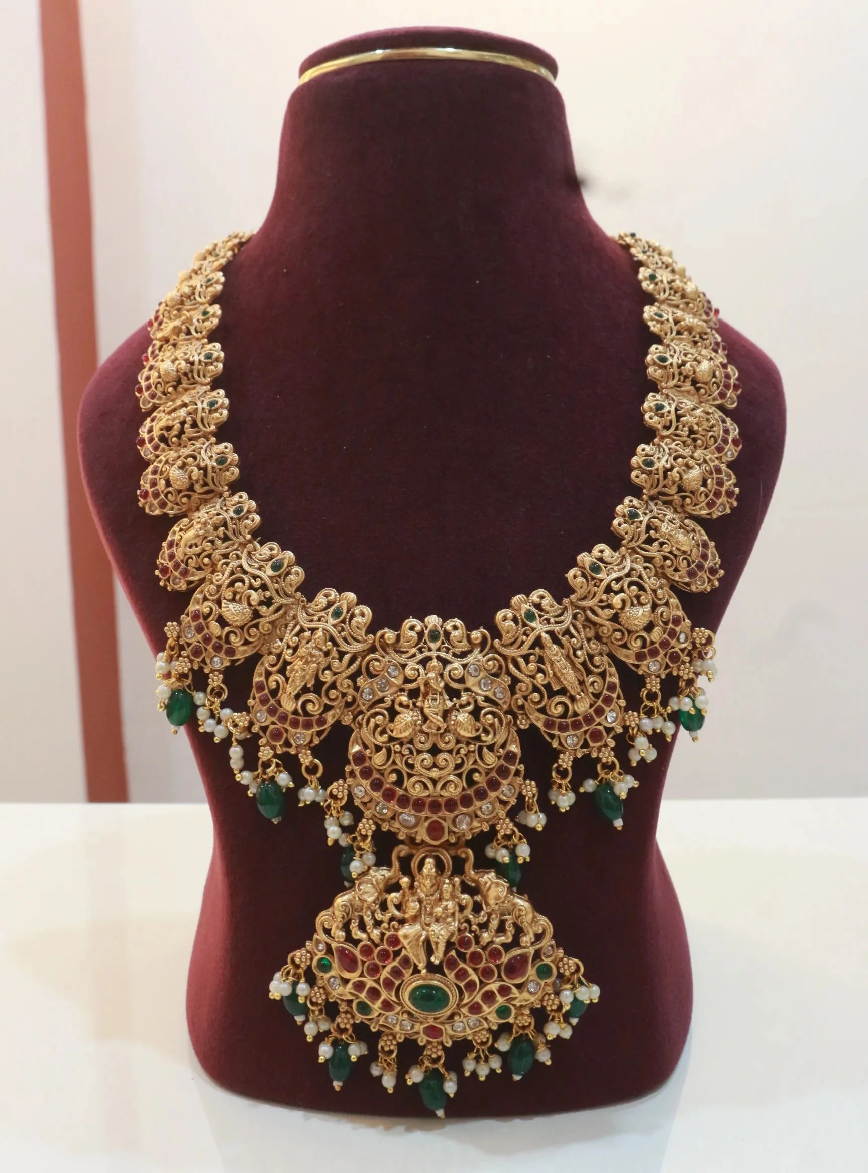 A magnificent temple antique necklace set adorned with intricate carvings, ruby and emerald detailing, and pearl drops â a true statement of heritage and divine elegance. ðð«