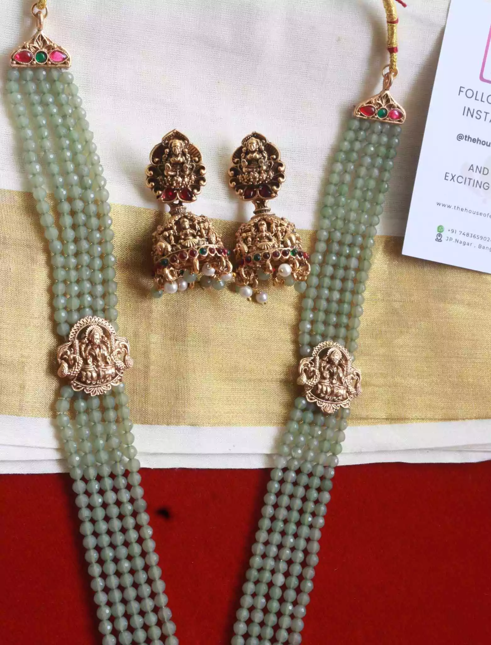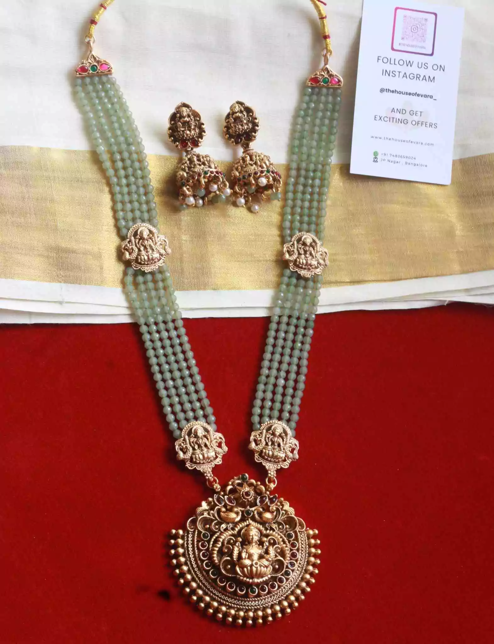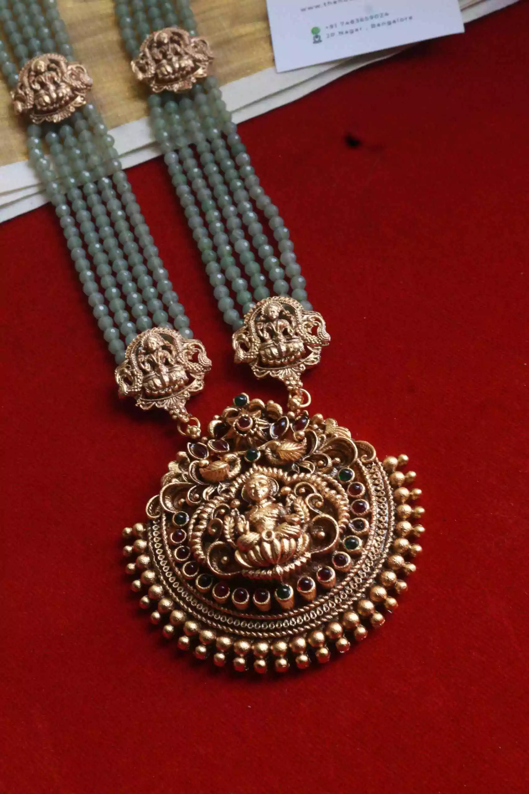 Design: Multi-strand beaded haram with Lakshmi motif connectors and a grand circular Lakshmi pendant